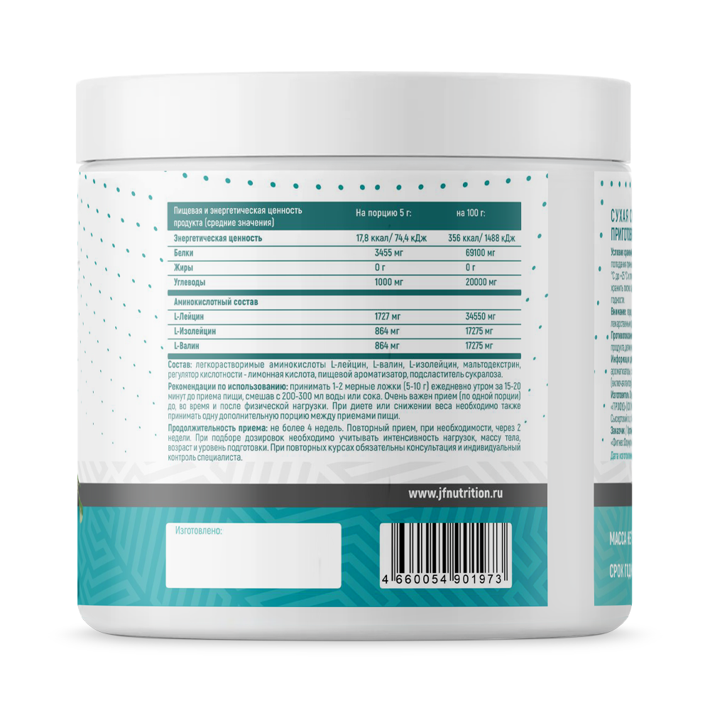аминокислоты с разветвленной цепочкой (L-лейцин, L-изолейцин, L-валин), мальтодекстрин, лимонная кислота, соевый лецитин, сахарозаменитель сукралоза.